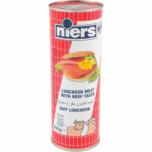 Niers Luncheon Biff erbjuder en kraftfull och genuin biffsmak med en något rustikare karaktär. Med sin fasta konsistens och rika köttighet passar den perfekt för dig som vill ha ett smakfullt och pålitligt pålägg, eller som en proteinrik ingrediens i matlagningen.
