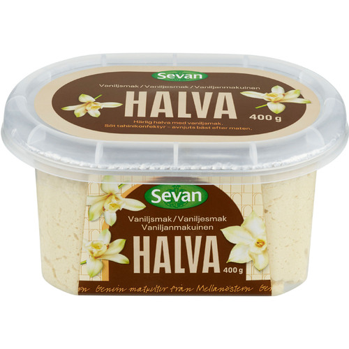 Sevans Halva är en konfektyr tillverkad av sötad, krossad tahini. Namnet ”Halva” kommer från arabiskans ”Halawa” som betyder just ”sött”. Den har en härlig karamellaktig smak, lagom sötma och är enkel att skära upp. Servera den gärna på traditionellt vis, med en kopp te eller kaffe, som fika eller efter måltiden. Det går även bra att använda Halva till glass eller som fyllning i tårtor. Kombinera den då gärna med Rosvatten eller Apelsinblomsvatten. Just denna har en härlig vaniljsmak.